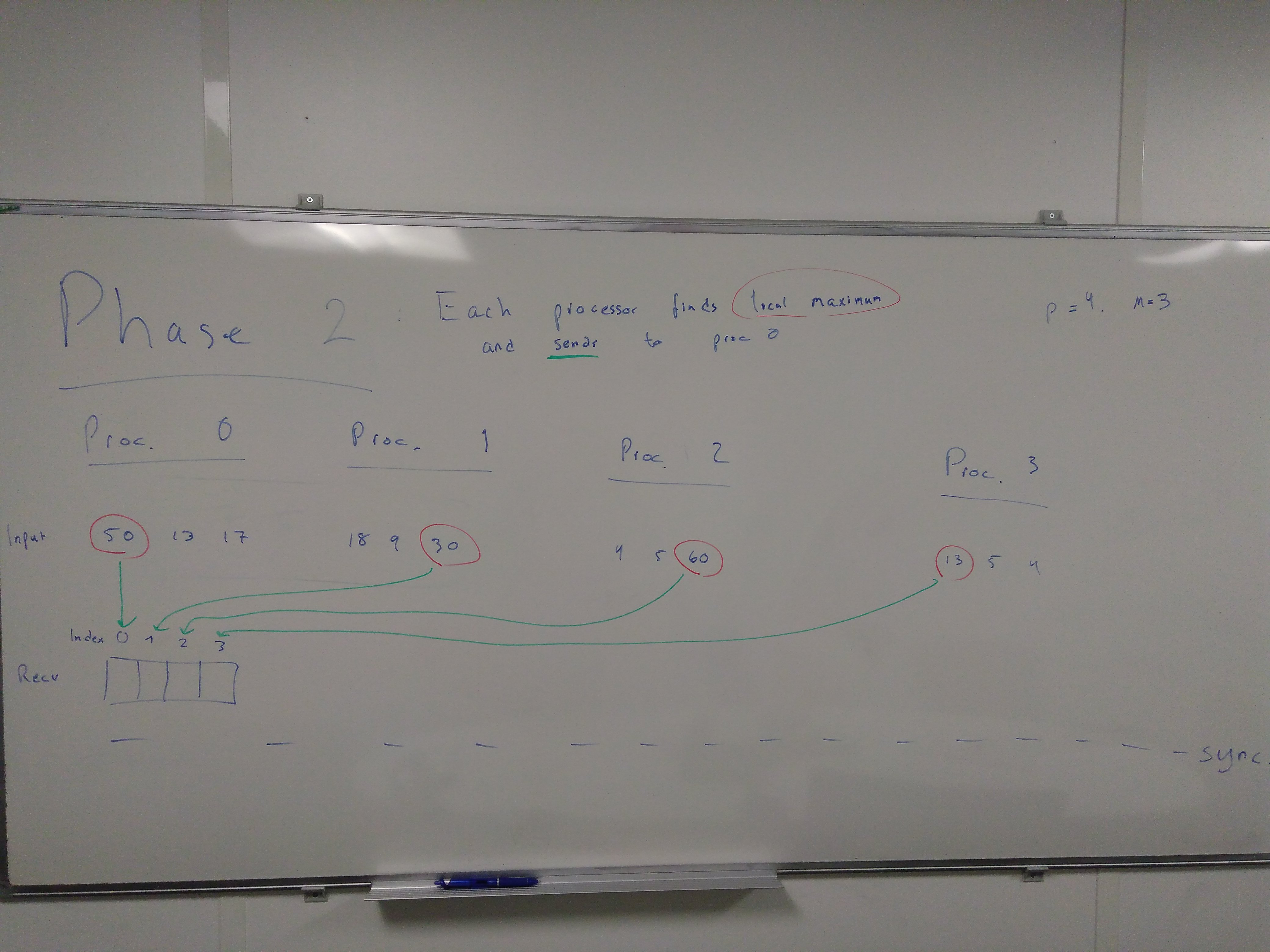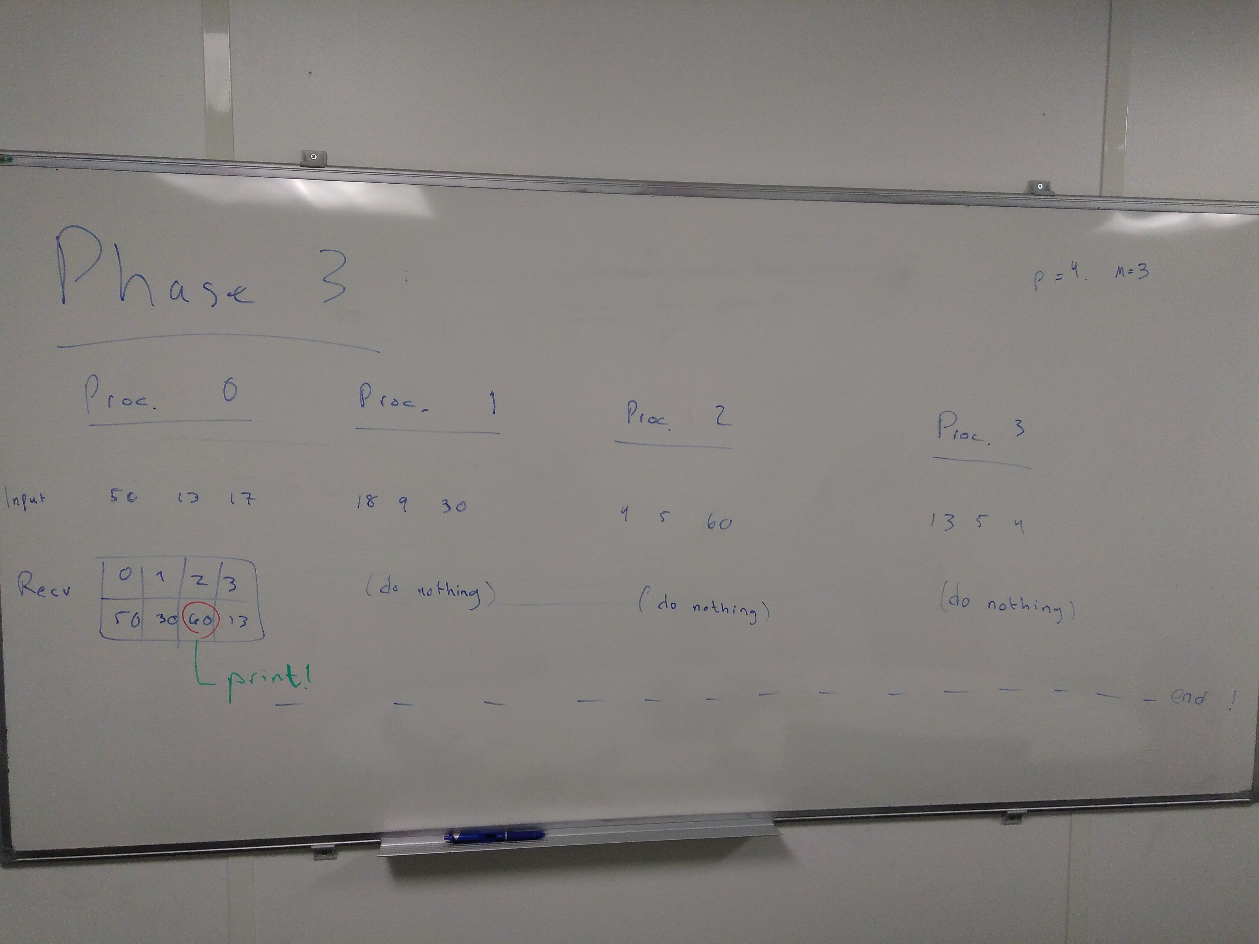 Here is an illustration of a run of the algorithm with 4 processors and \(M=3\), i.e. 3 elements per processors: